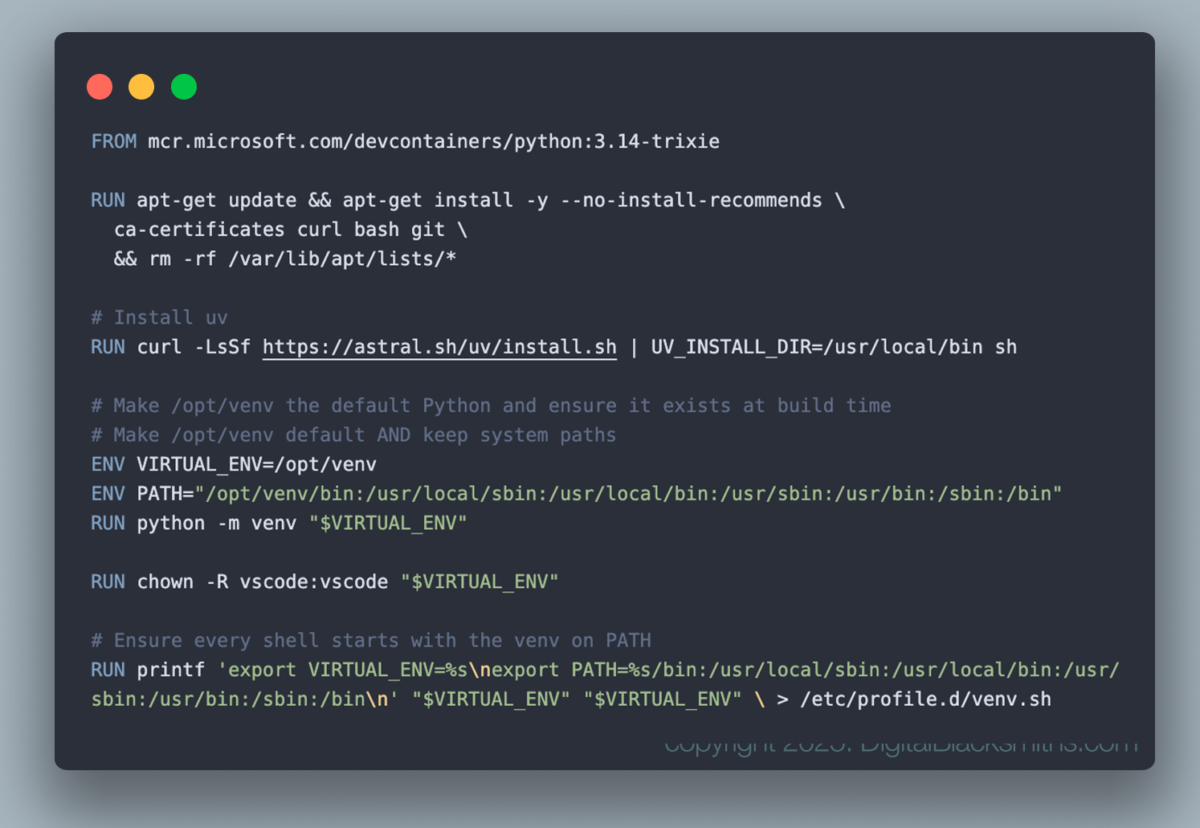 The container starts from a modern Python Linux image (the first line starting with FROM that builds it from the Debian “Trixie” base. This provides stability, excellent package availability, and predictable behavior for scientific Python libraries. It’s also a good match for compatibility with cloud VMs and container platforms.