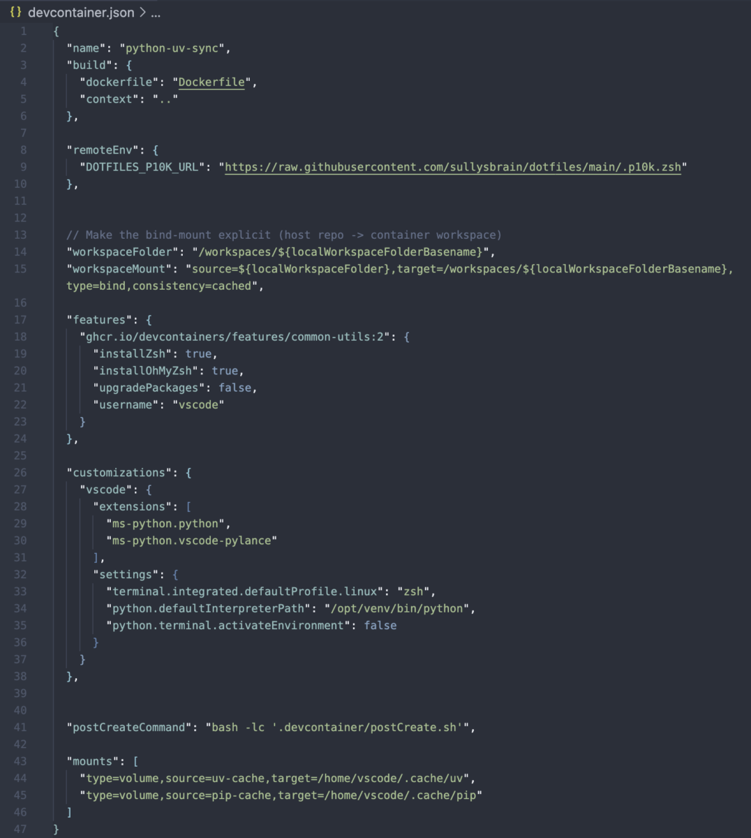 There’s a popular philosophy that the dev container should be a lean, bare bones image. For images you will deploy at large, sure, I agree. But for me, I wanted to replicate my personal development environment with the tools I’m used to using. Tools like zsh and uv instead of bash and pip, for example. So this is based with that idea. I’m not building containers that will be spun up hundreds of time to run one task and then destroy itself. Instead, I’m spending more time developing, and I don’t mind having an image that is a hundred Megs larger to build or that takes 2 minutes to build. I’m more concerned with having that reproducible environment.